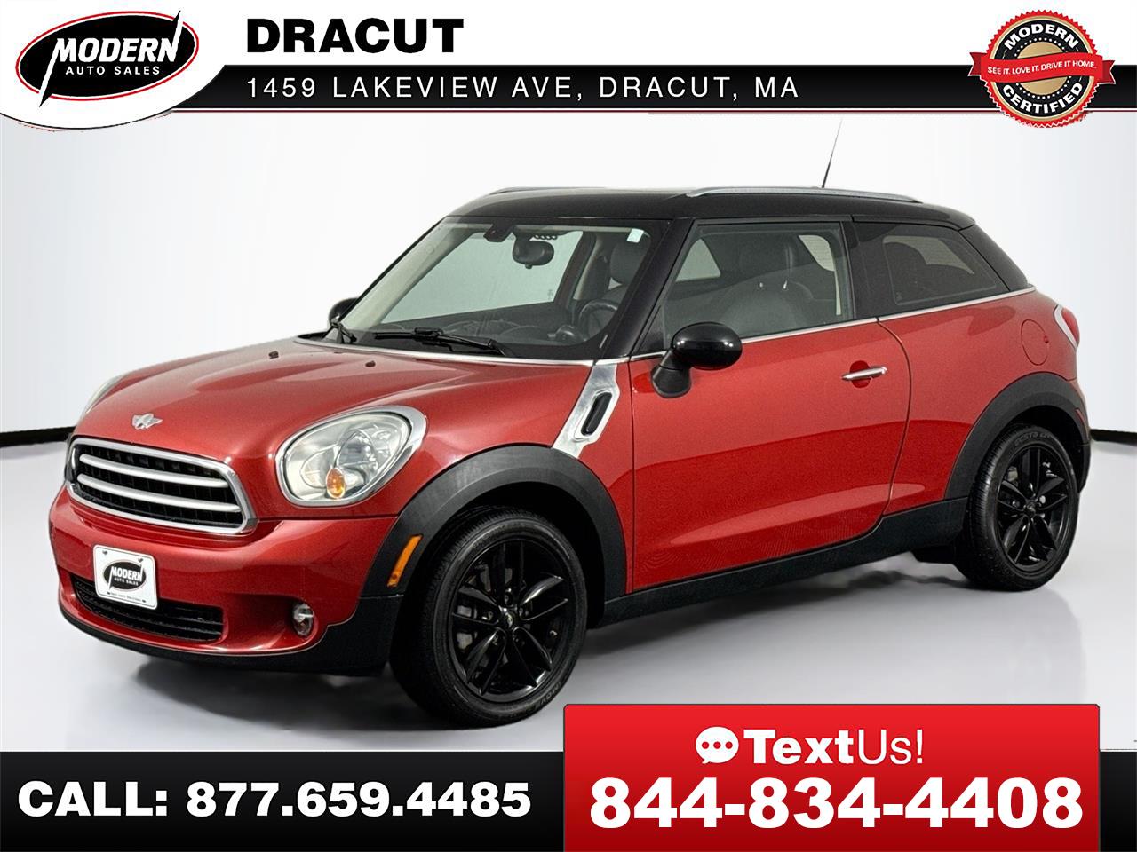 *MODERN CERTIFIED* MINI Cooper Paceman Hatchback, 1.6L 4 Cylinder Engine, 6 Speed Automatic Transmission, Push Button Start, MOONROOF / SUNROOF, BLUETOOTH Hands Free, Traction Control, LEATHER SEATS, HEATED SEATS, Privacy Glass, ROOF RACK, PARK SENSORS, Service Records Available, Written Warranty, NEW Brakes, GOOD Tires, NEW Wipers, Owners Manuals, Oil change Club Membership, FREE Loaner cars, and it has been PROFESSIONALLY DETAILED Top to Bottom, so it LOOKS and SMELLS like NEW!!! 4-Wheel Disc Brakes, ABS brakes, Additional Package Equipment, Automatic temperature control, City Package, Cold Weather Package, Electronic Stability Control, Fully automatic headlights, Heated door mirrors, Heated Front Seats, Moonroof, Power door mirrors, Rain sensing wipers, Rear Park Distance Control, Steering wheel mounted audio controls, Telescoping steering wheel, Tilt steering wheel, Wheels: 17' 5-Star Double Spoke Black. Clean CARFAX. 25/30 City/Highway MPG This is the one you want to make a deal on, its up to date on all service and maintenance and its available to take home today. Stop by for a closer look, you will love it. This 2015 MINI Cooper Paceman FWD Hatchback has been through our Modern Certification Process, which includes a Written Warranty, a Complete Auto Detail, Spare Keys, Owners Manuals, a Full tank of Gas, FREE Carfax Vehicle History Report, 120-Point Rigorous Inspection, access to the vehicle service records, and Live Market Pricing, so you will have all the information you need to make a confident decision. Here at Modern Auto Sales we make the purchasing process easy and hassle free. If you've been searching for just the right vehicle, as well as the right dealership, then stop your search here. Give us a call or submit a form here on this site to schedule your visit, we promise not to waste your time, and you will be given the attention you deserve. Here are some of the added benefits you get when you buy from Modern Auto Sales * Written Warranty * Future service and maintenance discounts * Free Loaner car for Life * 2 Sets of Keys * Owner's Manual * First Stain Removal Free * Free windshield chip repair * Free oil change club Membership * Free Digital inspection every time you're in for service * AND SO MUCH MORE. Buy your next car the Modern Way and skip the hassle of the traditional dealerships.Our live market pricing with history adjusted valuation and daily discounts ensure that you'll get the best deal possible 7 days a week. Whether you prefer to visit us in person, or buy online and have your car shipped directly to you, we're here to make your car buying experience as easy and stress free as possible. What is a History Adjusted Valuation? A History Adjusted Valuation is a tool used to determine the value of a vehicle. It takes into account the vehicle's history, including events like accidents, ownership changes, and title brands. Black Book uses Experian AutoCheck data to provide this type of valuation. When you provide the vehicle's VIN, Black Book retrieves the AutoCheck report and adjusts the value based on the history events found in the report. Think of it like adjusting the value based on the vehicle's history, similar to how the value might be adjusted for the mileage.Visit Modern Auto Sales Dracut online at www.modernautosalesofdracut.com to see more pictures of this vehicle or call us at 978-815-6520 today to schedule your test drive.